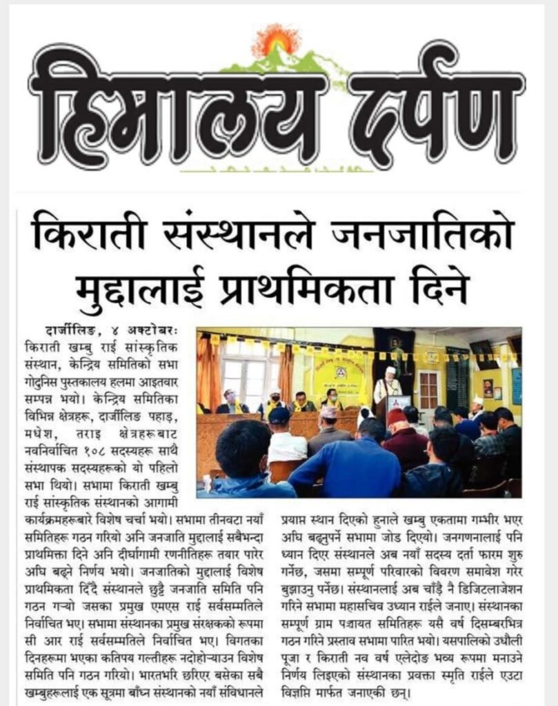 दार्जीलिङ, अक्टोबर ३: किराती खम्बु राई सांस्कृतिक संस्थान केन्द्रिय समितिको सभा गोदुनिस लाईब्रेरी हलमा आईतवार को दिन सम्पन्न भएको थियो । केन्द्रिय समितिको नव निर्वाचित कुल १०८ सदस्यहरु मध्ये ४३ जना सदस्यहरु साथै संस्थापक सदस्यहरुको उपस्थिती थियो । सभाको कोरम ३६ जना सदस्यहरु हुन। संस्थापक सदस्यहरुमा श्री हेमु राई, श्री भरत प्रकाश राई, श्री विजय कुमार राई, श्री गजेन्द्र राई र श्री कैलाश राई उपस्थित थिए।