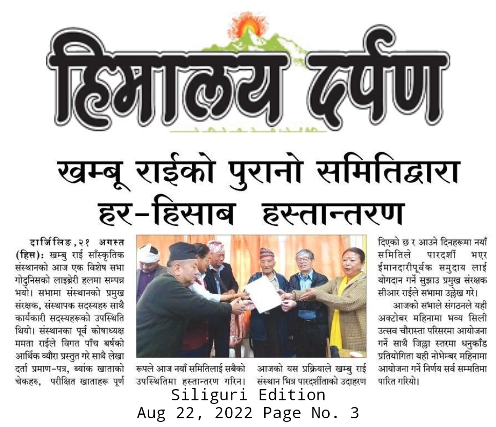 August 21, 2022: हाम्रो संगठन, किराँती खम्बु राई साँस्कृतिक संस्थानको लामो समयकाे विशेष प्रयासमा आज हस्तान्तरण कार्यक्रम सभा गो. दु. नी. स. लाइब्रेरी कक्षमा श्री डाक्टर प्रताप सिंह राई को सभापत्यमा सम्पन्न भयो। नयाँ संस्थानको पक्ष बाट संस्थानको प्रमुख संरक्षक श्री सी आर राई, संस्थापक सदस्य श्री हेमू राई, साथै संस्थानको कार्यकारी सदस्यहरू बाघडोग्रा, मिरिक, खरसाङ, दार्जीलिङ जिल्ला समिति र केन्द्रीय समितिको पदाधिकारी गणहरु उपस्थिति थिए। हस्तान्तरण समितिको अध्यक्ष श्री संतोष राई स्वास्थ्य समस्याको कारणले आजको सभामा उपस्थित हुन सक्नु भएन र उहाँको स्थानमा कोषाध्यक्ष श्री अनुप राईले कार्यवहन गर्नु भएको थियो। भूतपूर्व समिति बाट पूर्व कोषाध्यक्ष श्रीमती ममता राईको उपस्थिति थियो। आजको कार्यक्रम सञ्चालन श्री किशोर राई मुक्सुले गर्नु भएको थियो।