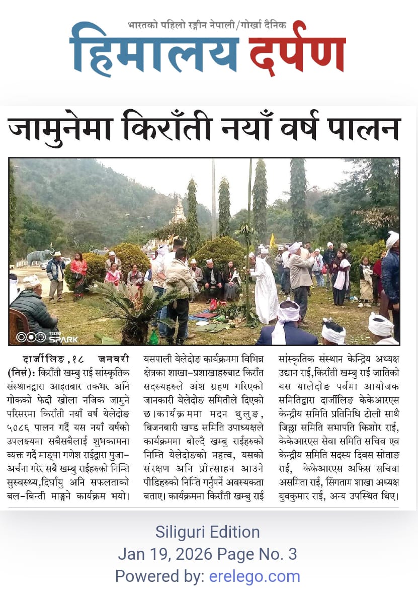 January 18, 2026: Kiranti Khambu Rai Sanskritik Sansthan (KKRSS) has celebrated the Kiranti New Year, Yeledong 5086, as the new year of the Khambu Rai community. As usual, KKRSS has celebrated its New Year at the premises of Jamuni Park. KKRSS has a separate committee to celebrate the Khambu Rai New Year, the Yeledong committee, which organizes this New Year festivity. This year, members from Bijanbari block, Takhvar valley, and Darjeeling town participated in the event. Mangpa Ganesh Rai performed the rituals at the ceremony and blessed the Khambu Rai members present at the event. Shri Madan Thulung highlighted the importance of Yeledong, and General Secretary of KKRSS Shri Udhyan Chamling assured such an event every year for the awareness of the coming generation of the Khambu Rai community. Shri K. B. Water and distinguished members of KKRSS were present during the occasion.