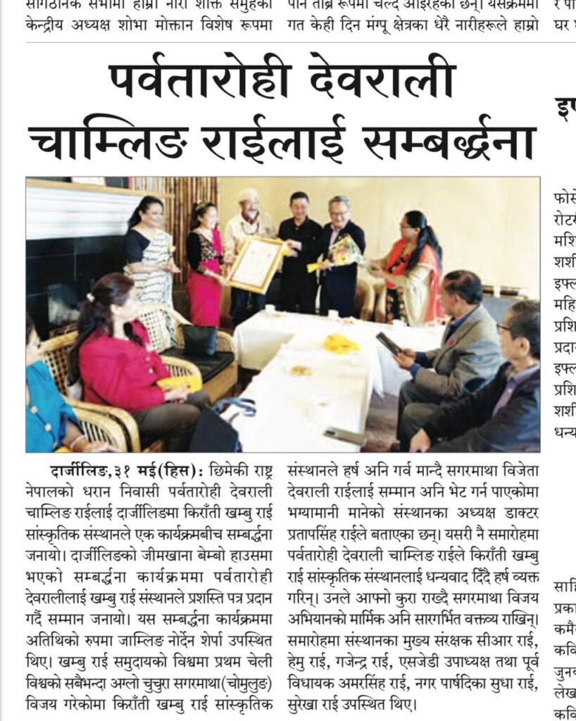 May 31,2022: KKRSS Central committee felicitated Miss Deurali Chamling who is amongst the team of the First Women Journalists Everest Expedition-2018 making it to the top of 8848-metre peak with the slogan ‘Unified Voice for Equity’. She is also the first Khambu Rai (Women) to ever climb Mount Everest.