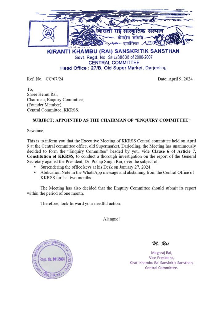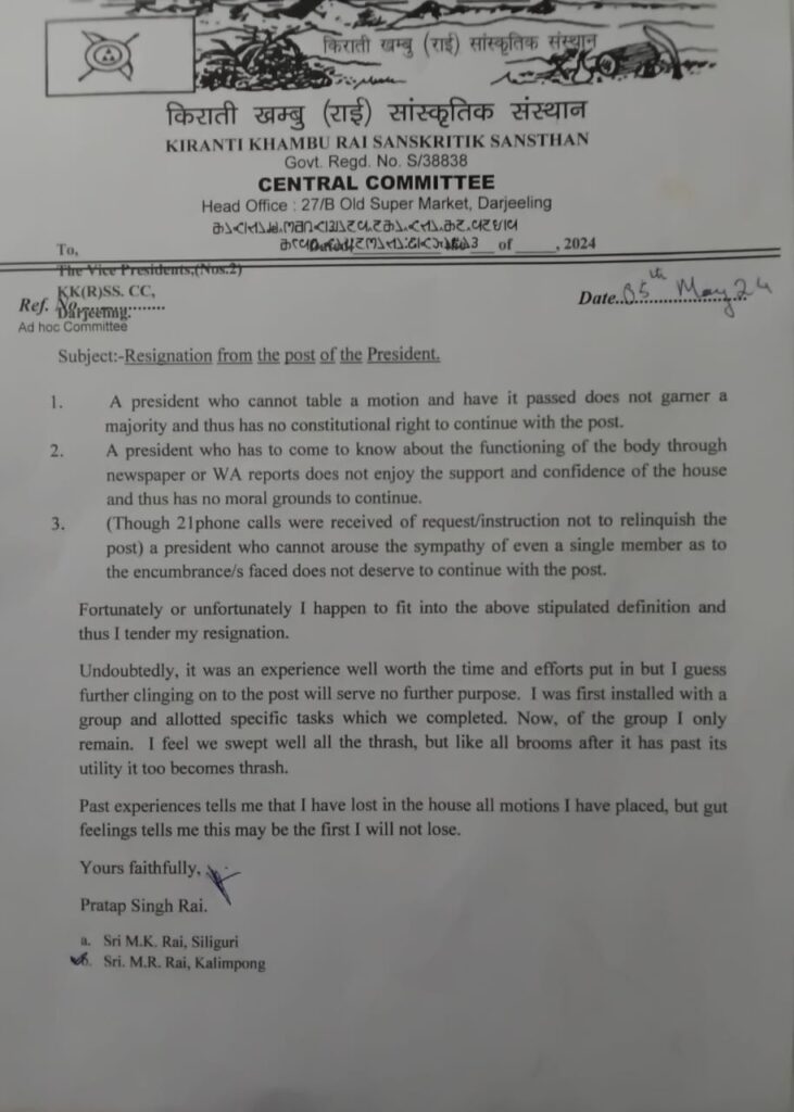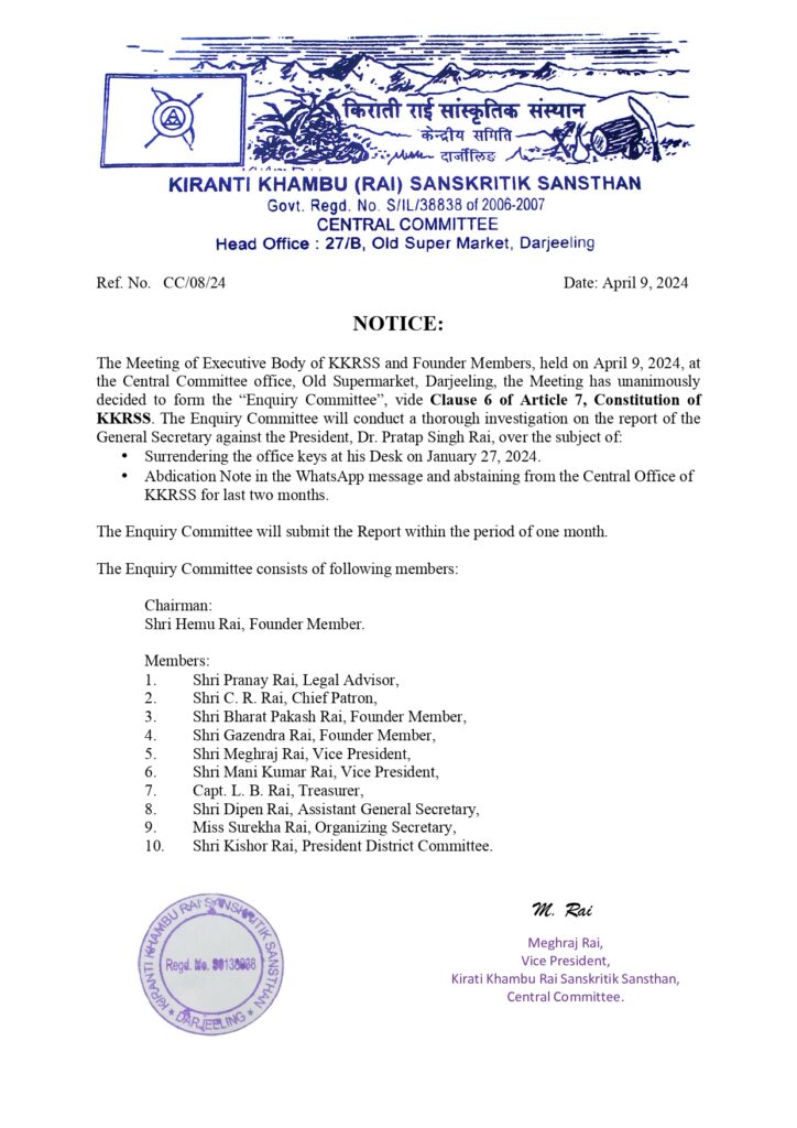 March 7, 2024: President of KKRSS, Dr. Pratap Singh Rai, elected as a president of KKRSS on January 7, 2024, for the second term, has resigned today. He left the office key and wrote the Note in the official WhatsApp group of KKRSS. Following this, an Executive Meeting was called on by Vice President Shri Megraj Rai on April 9, 2024, and formed the inquiry Committee of 10 Executive Members, headed by Shri Hemu Rai, the Founder member. However, the formal Resignation letter was submitted by the President only on May 15, 2024, which officially accepted the Resignation by the committee.