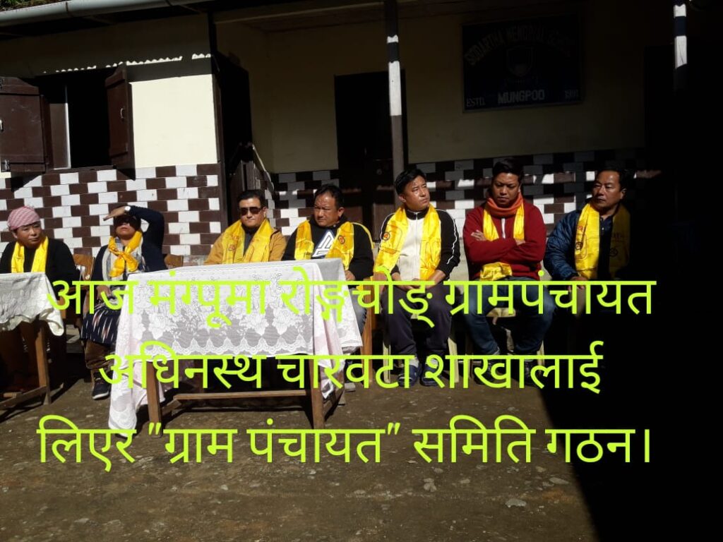 आज मंग्पु विभागको सिद्दार्थ मेमोरियल स्कुलमा मंग्पु क्षेत्रीय समितिका चारवटा शाखाहरु क्रमैले मंग्पु शाखा , सिम्ले शाखा , चालीस शाखा अनि रोंगचोंग शाखाका खम्बु राइपा राइमाहरुलाई लिएर एक सभाको आयोजना गरियो अनि आर आर ब्लक अधिनस्त रोंगचोंग ग्राम पंचायत समिति गठन गरियो ।