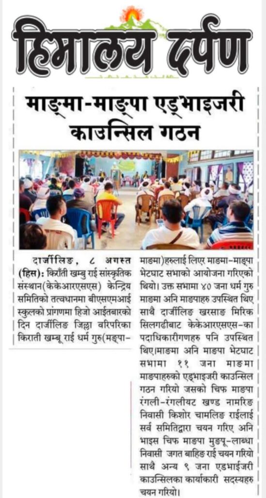 August 8, 2022: किरांती खम्बु राई सांस्कृतिक संस्थान, केन्द्रिय समितिको आयोजनामा हरसिंग हट्टा, लेबोंगस्थित बिएसएमआई स्कुलमा दार्जिलिंग पहाड, तराई क्षेत्रका जम्मा ४० जना मांग्पा मांग्माहरूको उपस्तिथिमा एउटा महत्वपूर्ण अनि ऐतिहासिक सभा सम्पन्न भयो सभामा मांग्पा मांग्माहरूलाई लिएर सल्लाहकार मण्डली गठन गरिएको छ जसमा नामरिंग निवासी मांग्पा श्री किशोर चामलिंग राई अनि मंग्पू लाब्दा निवासी मांग्पा श्री जगत बाहिंग राईलाई प्रमुख समन्वायक अनि उप समन्वायक चयन गरि अन्य ९ जना मांग्पा मांग्माहरूको कार्यकारीणी समिति गठन गरियो ।